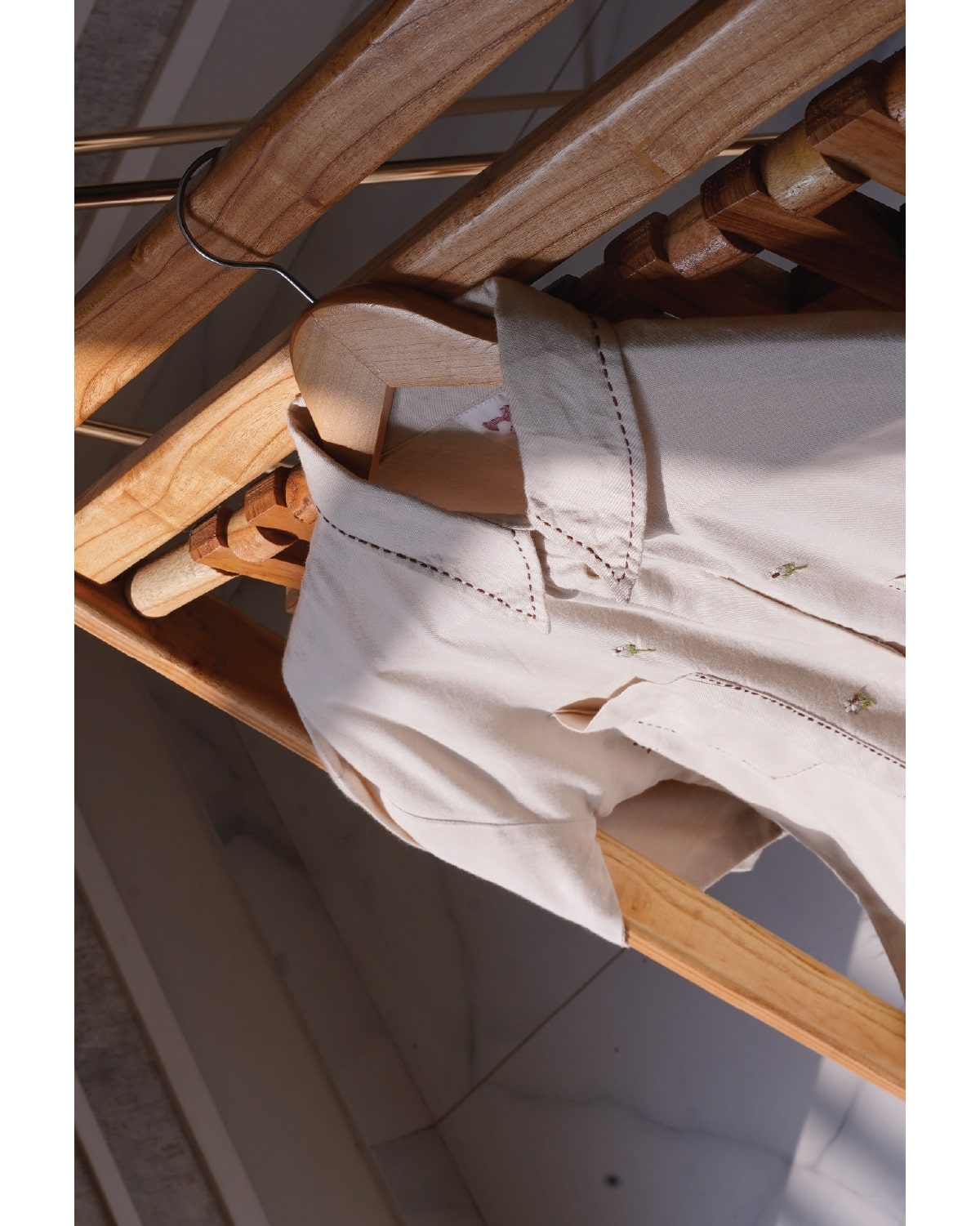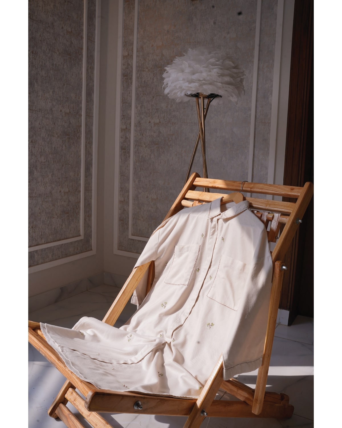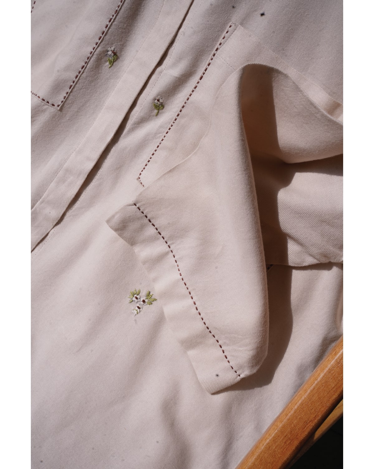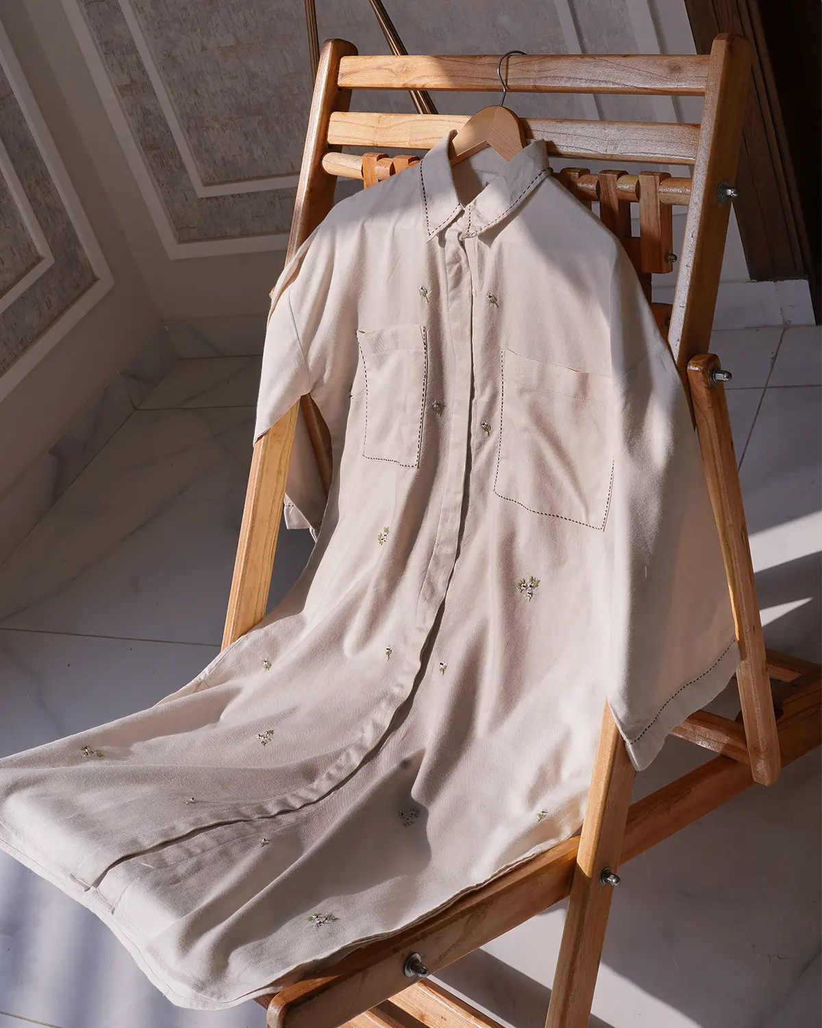 Description: Crafted in premium marina, this beige long shirt brings warmth and softness to your winter wardrobe. Designed with a structured collar and dual front pockets, each accented with delicate threadwork and a subtle floral spread for an elegant touch.