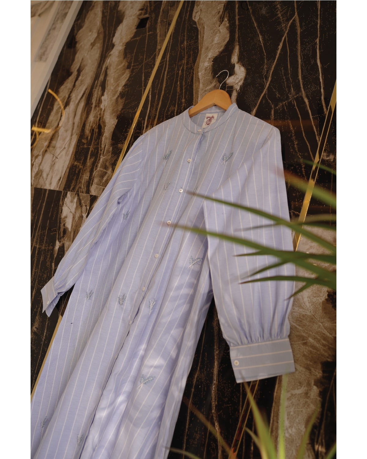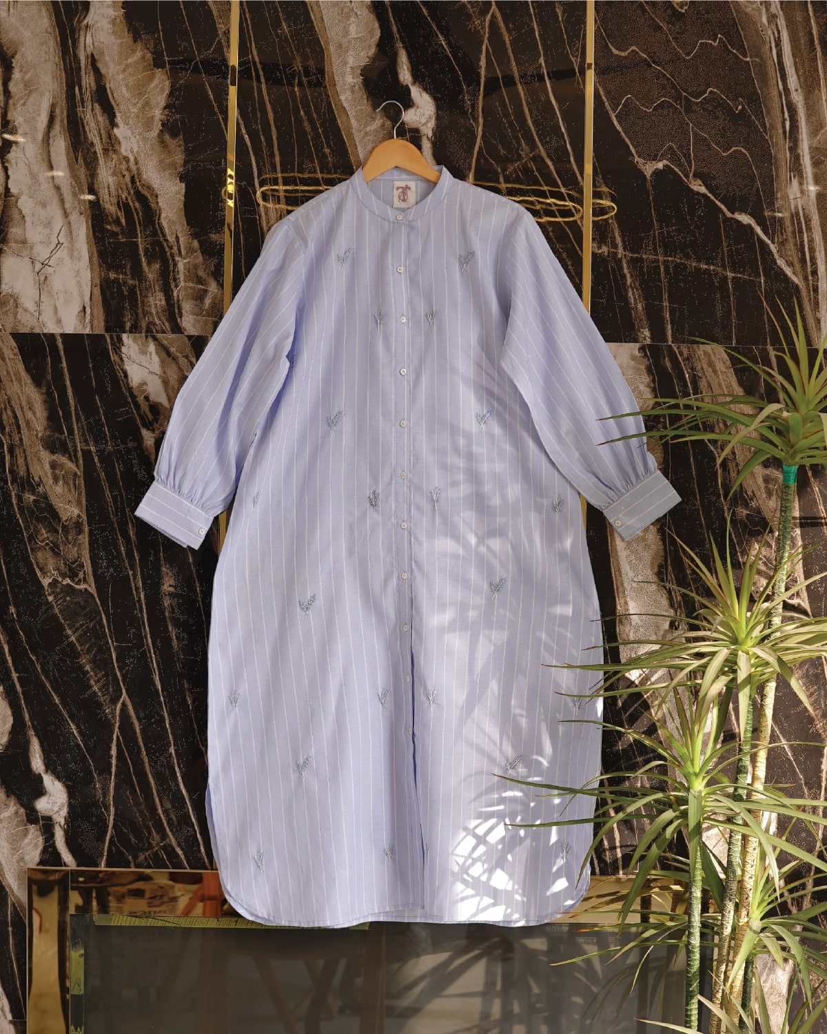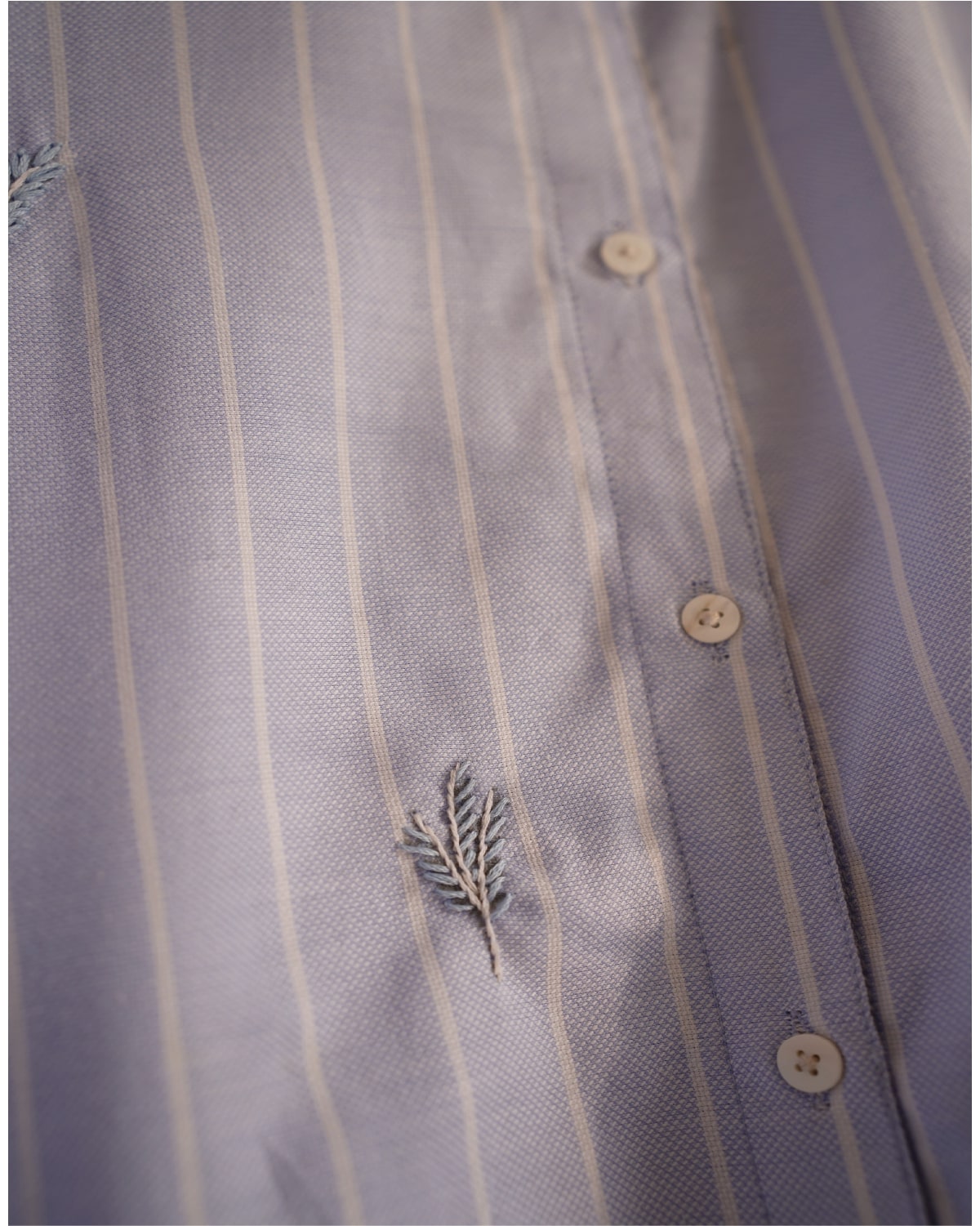 Description: A light-blue lined polo long shirt adorned with delicate floral motifs scattered across the front. Designed with a neat collar and a full button-down opening, it blends everyday ease with understated charm. You can pair it with jeans, trousers, or a plain scarf for a refined, effortless look.