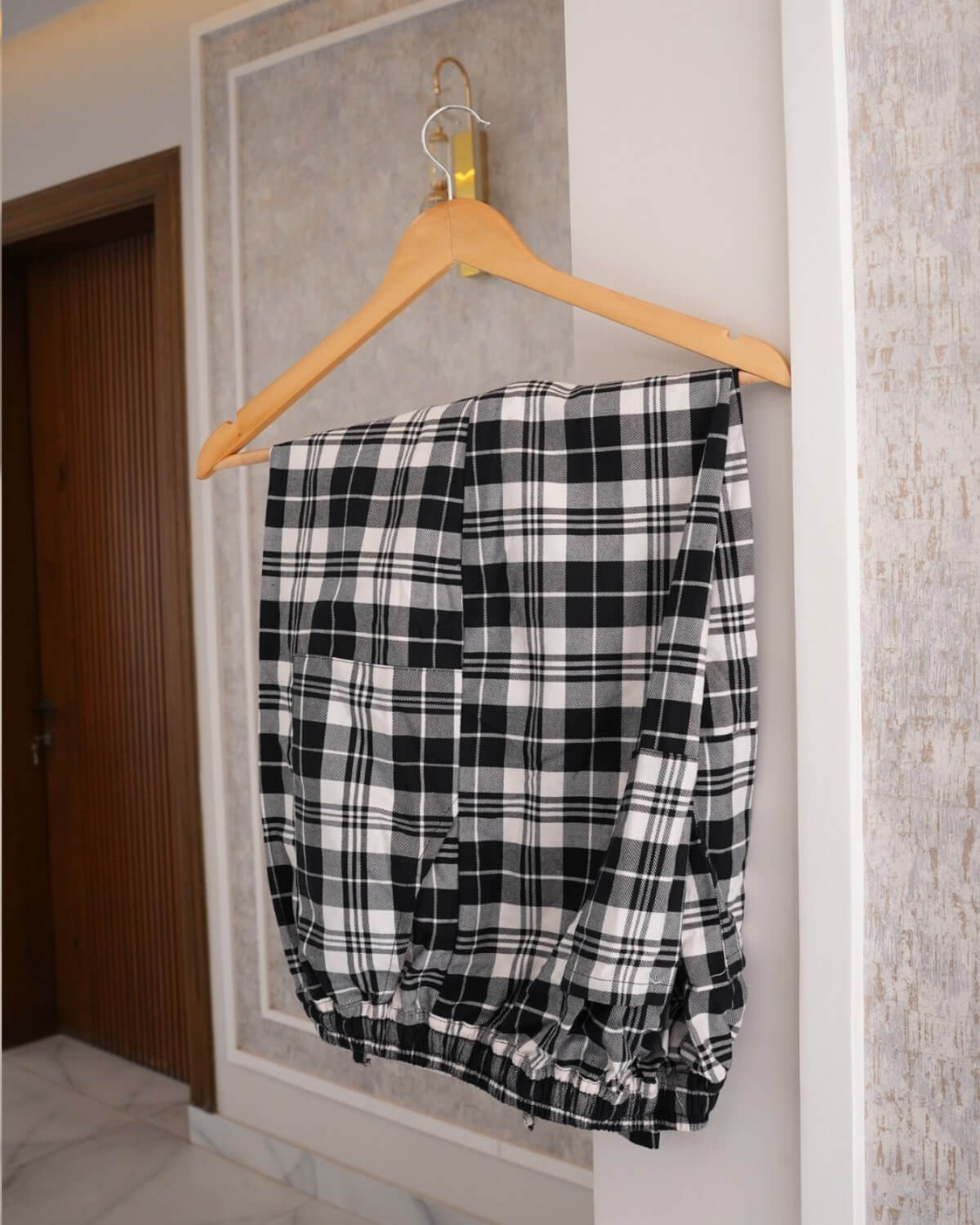 Comfy Checkers features striking monochrome squares that bring together classic winter style and everyday ease. Crafted from warm wool fabric, these trousers are designed to keep you cozy while making a bold yet timeless statement. Perfect for relaxed days, casual outings, and winter lounging.