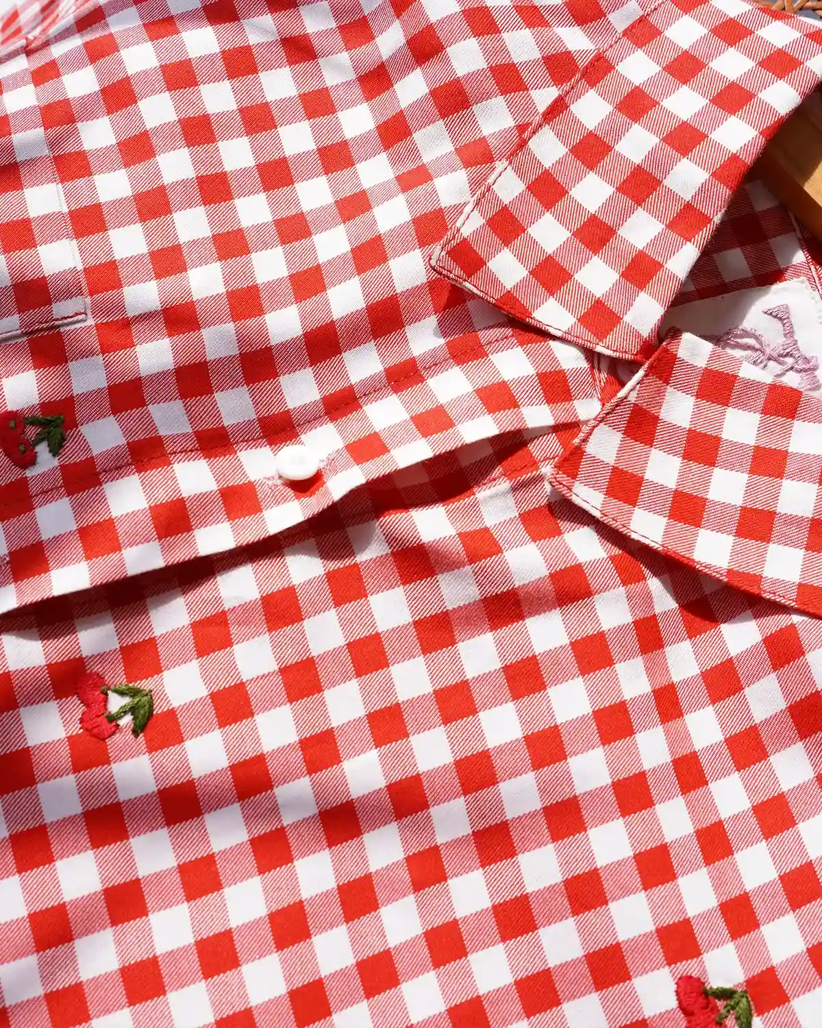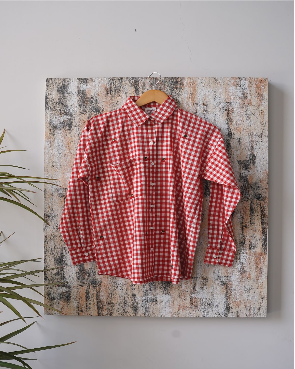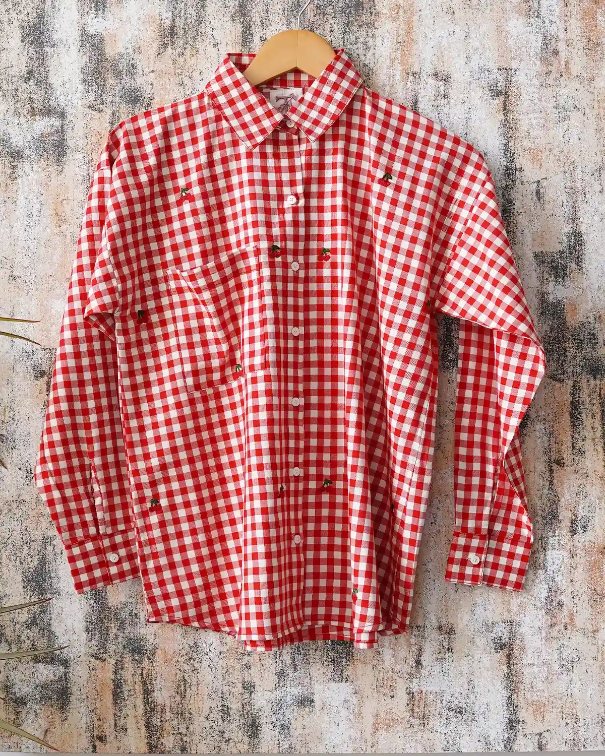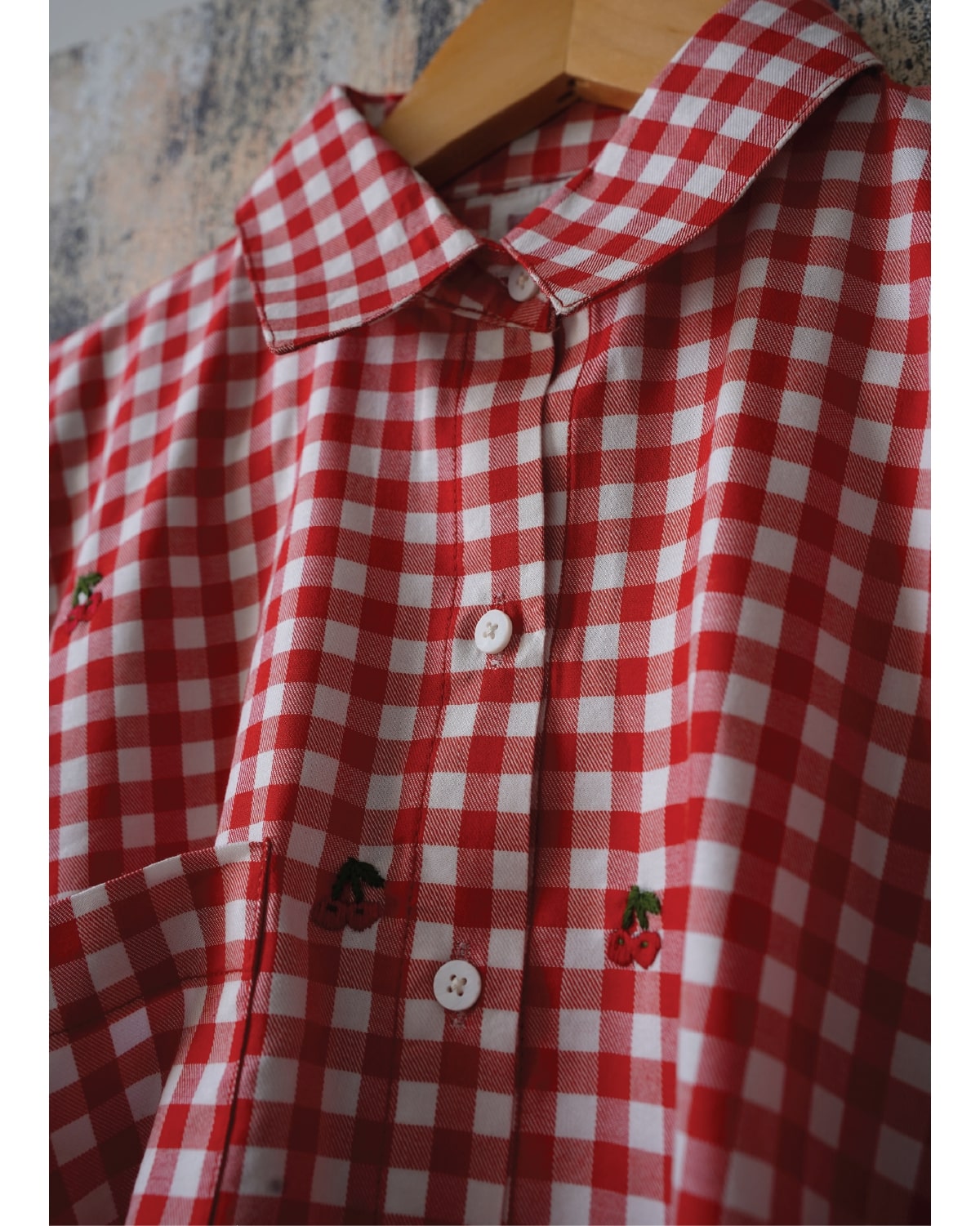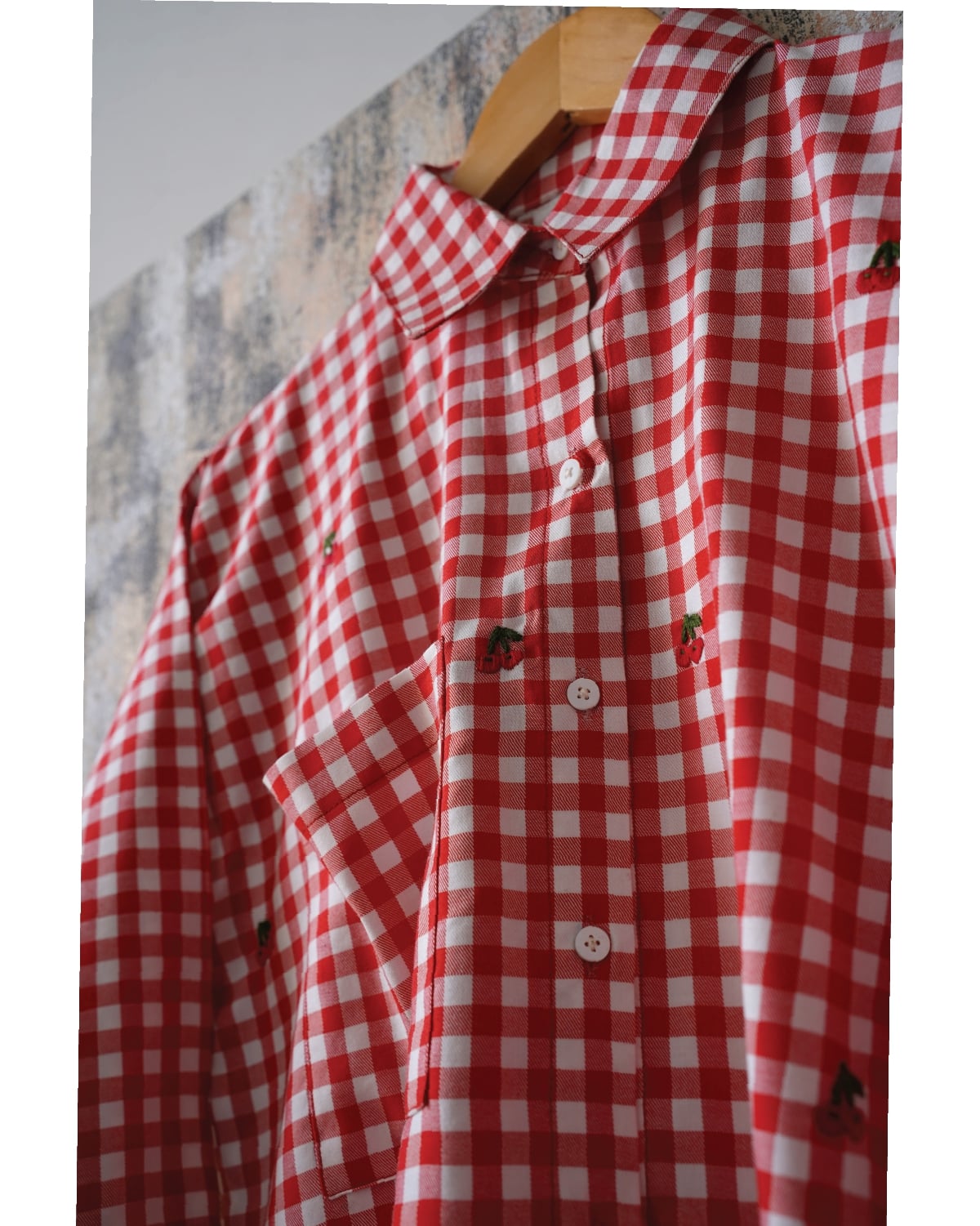 Description: Step into winter with the Cherry Cozy Check. The classic button-down silhouette gets a charming upgrade with mini cherry embroideries for that subtle, standout detail. Style it with jeans, tights, or layered under sweaters for the cutest winter looks.
