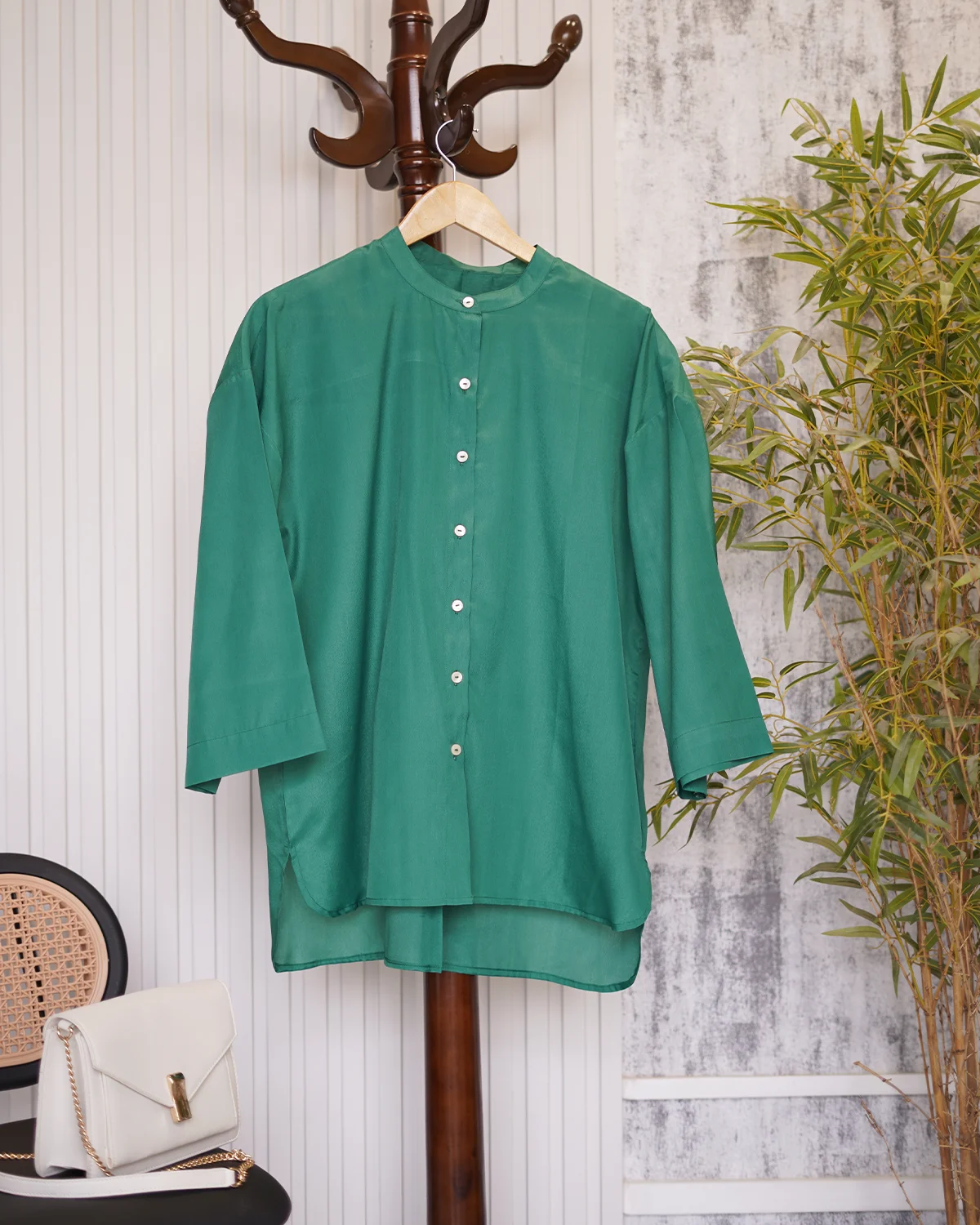 Description: Emerald Ease is a silk button-down in a rare green hue, defined by graceful cuts and quiet sophistication. A timeless wardrobe essential — effortless, elegant, and made to be your shade of calm this fall.