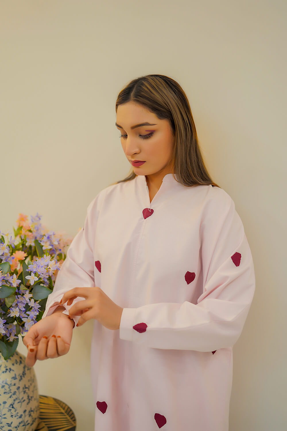 The Heartstrings Co-Ord Set features delicate embroidered hearts scattered across pastel cotton, adding a poetic touch to everyday wear. Relaxed, minimal, and effortlessly charming — made for slow days, sweet moments, and anyone who loves subtle statement details.