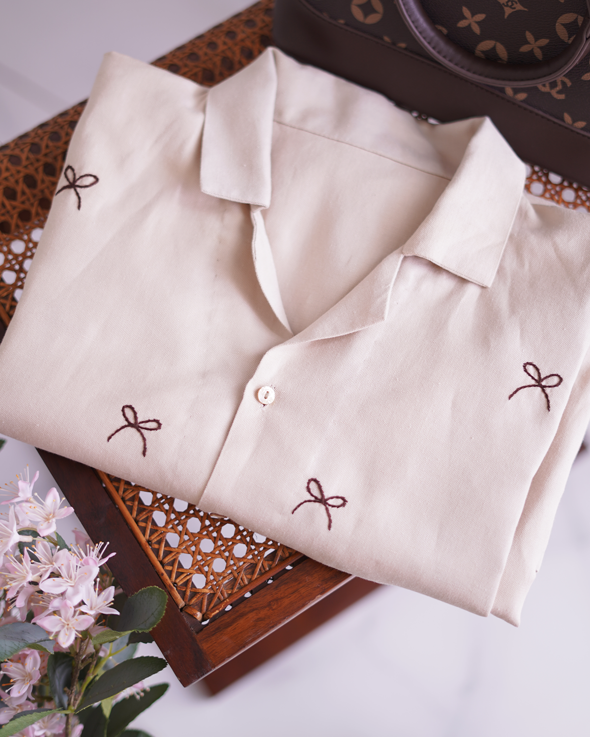 Article description: Mocha Muse features delicate black bow embroidery on soft sandy beige, paired with a classic collar and button-down finish. A modern statement in slow fashion, designed for comfort, confidence, and timeless appeal.