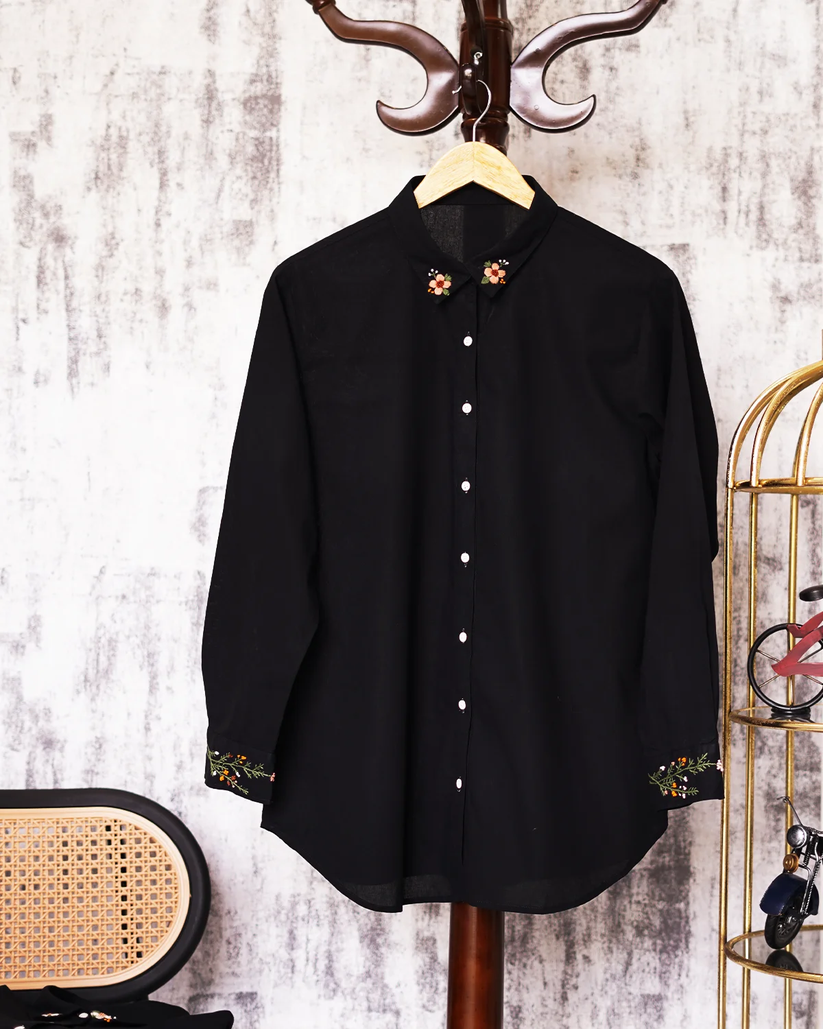 Stuff: PoloArticle description:Noir Bloom is a black embroidered polo shirt adorned with delicate floral details and refined motifs. Made in-house with premium fabric, it celebrates slow fashion and timeless elegance for your cozy fall days.