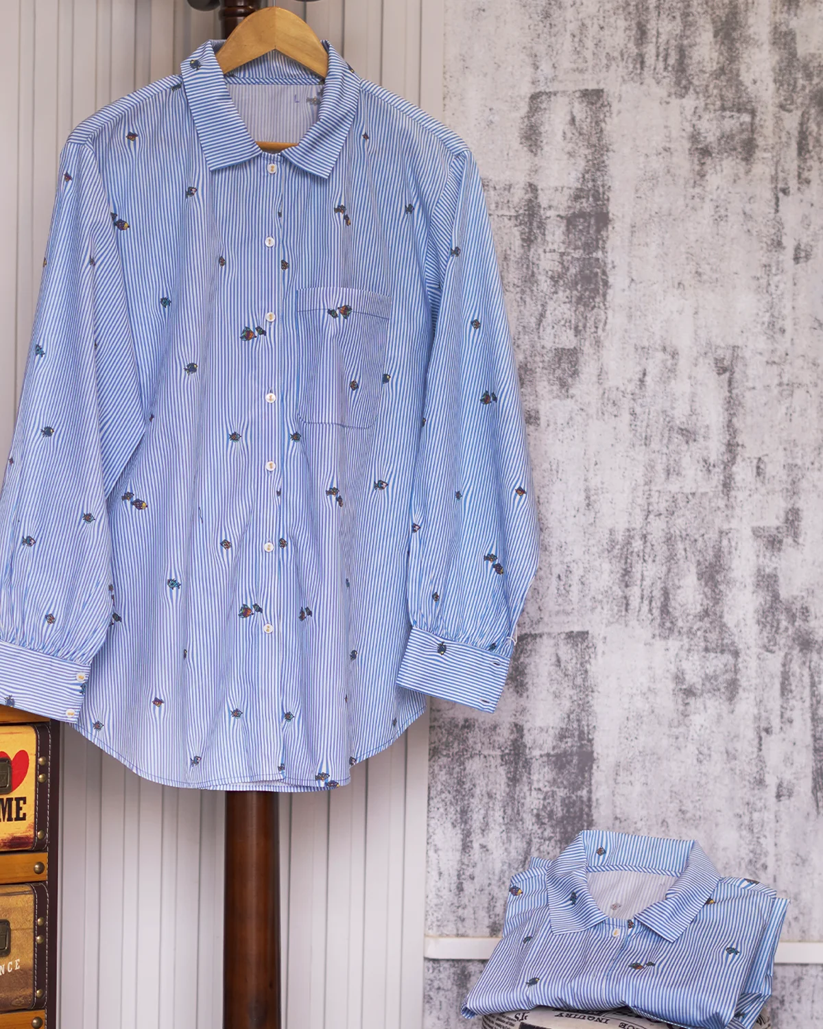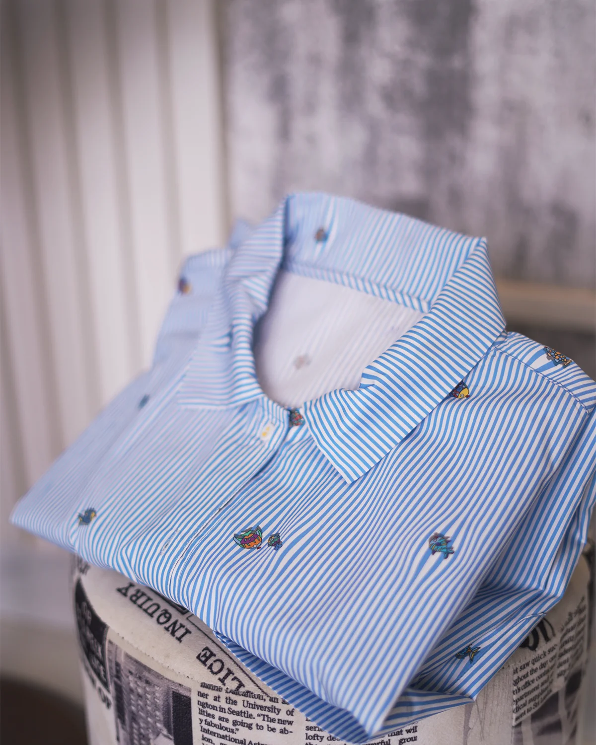Description: A uniquely printed blue button-down shirt featuring a whimsical spread of fish prints, detailed with a touch of thread artistry on the buttons. Ocean Whispers captures the calm of the sea and the creativity of design — a perfect pick for those who love statement pieces with a story.